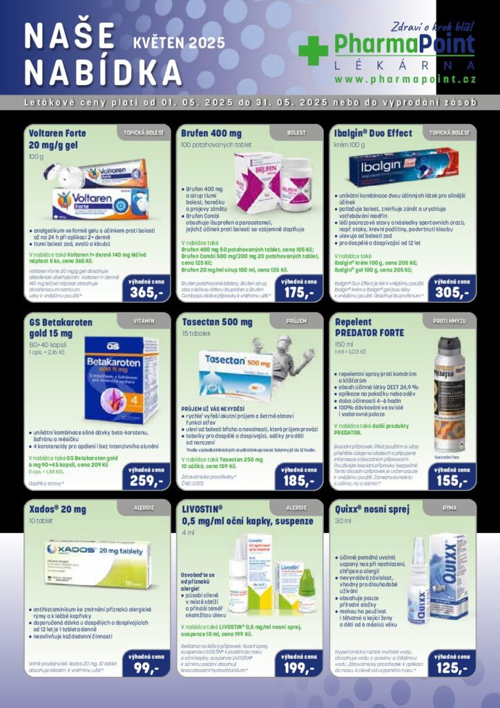 Prohlédněte si naší aktuální letákovou nabídku pro měsíc květen. Nabídka probíhá v lékárnách Pharmapoint od 01.5.2025 – 31.5.2025.